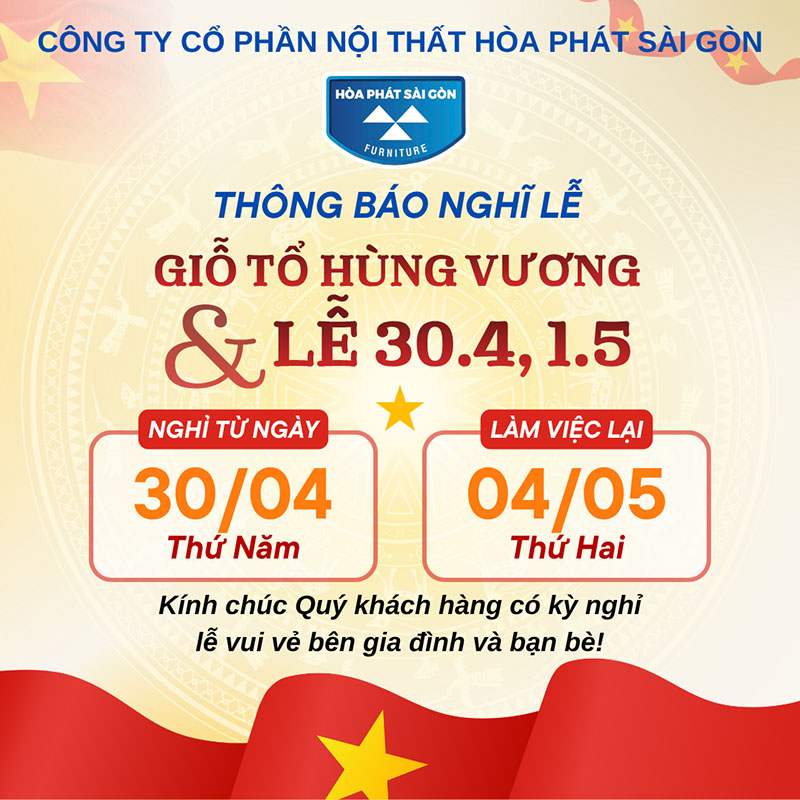 – Hòa Phát Sài Gòn thông báo lịch nghỉ Giỗ Tổ Hùng Vương, Giải Phóng Miền Nam 30/4 và Quốc Tế Lao Động 1/5 –