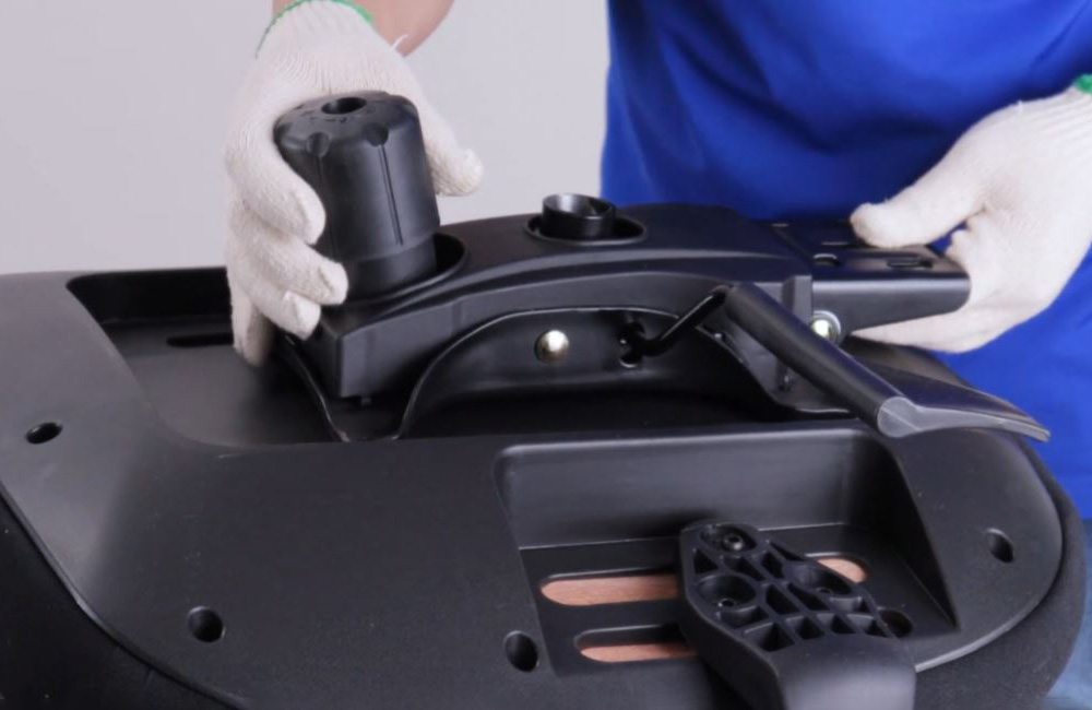 Xác định hướng đúng: Tìm chữ “FRONT” hoặc mũi tên trên mâm ghế và hướng nó về phía trước đệm ngồi. Núm vặn tròn lớn cũng sẽ quay về phía trước.