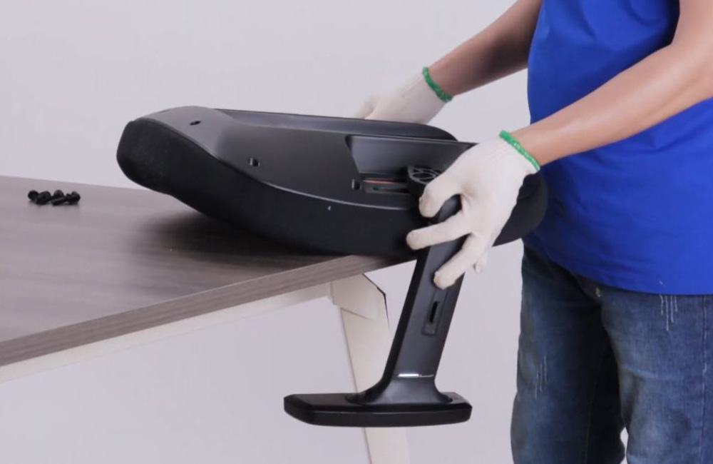 Lật úp đệm ngồi lên mặt phẳng, xác định đúng tay vịn trái (L) và phải (R). Đặt tay vịn vào hai bên hông đệm và dùng ốc vít cố định vào các lỗ có sẵn.