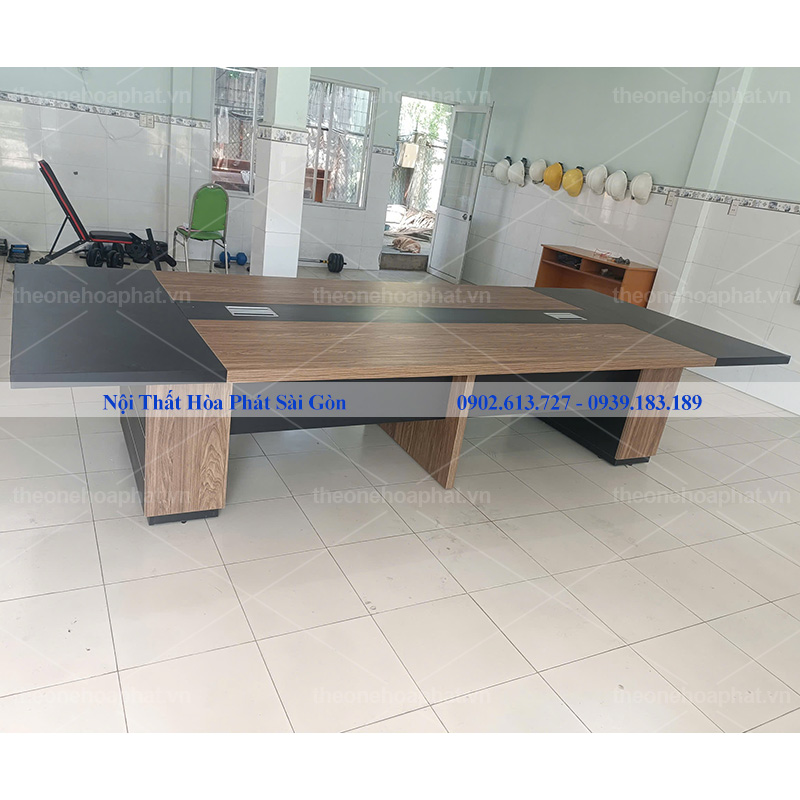 - Mặt bàn được thiết kế ghép giữa màu đen và vân gỗ, tạo ra một hiệu ứng thị giác độc đáo, tinh tế và phong cách. Sự kết hợp này không chỉ tạo điểm nhấn cho không gian họp mà còn giúp nó trở nên ấn tượng và độc đáo.