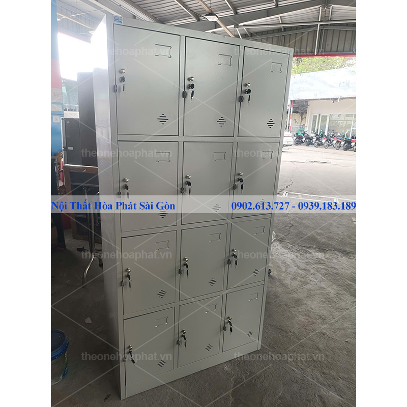 - Tủ có 12 khoang rộng rãi và cánh mở, trên mỗi cánh được trang bị một khóa Locker, núm tay nắm và tai khóa móc.