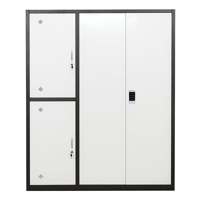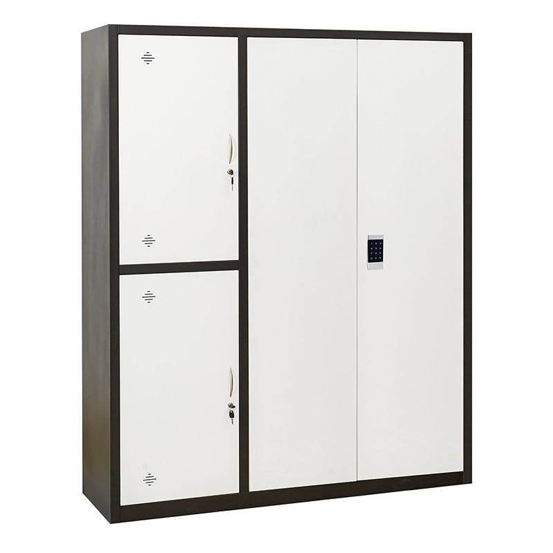 Tủ sắt an toàn TU09K3E bằng thép dày sơn tĩnh điện màu cà phê – trắng. Tủ gồm có 3 khoang, khoang phải có 3 đợt di động, cánh tủ lắp khóa điện tử, 2 khoang bên trái mỗi khoang có 1 đợt di động, cánh lắp khóa locker và tay nắm mạ.