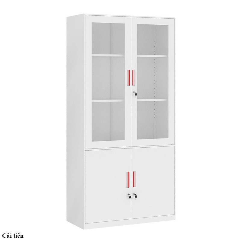 - Thiết kế tủ được trang bị khoang trên có cánh kính và 2 đợt di động, cùng với khoang dưới có 2 cánh sắt mở.