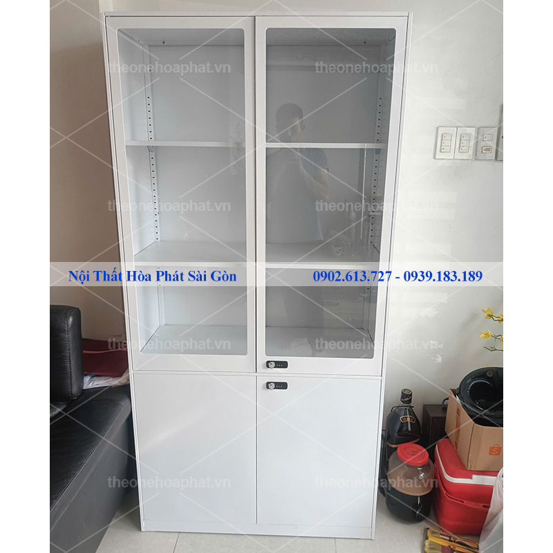 Tủ sắt văn phòng TU09K3S sơn tĩnh điện màu trắng sáng phù hợp với không gian văn phòng hiện đại. Tủ có khoang trên là khung cánh kính với 2 đợt di động, khoang dưới 2 cánh sắt bên trong có 1 đợt di động. 2 Khoang cánh tủ sử dụng khóa số an toàn và tiện dụng.