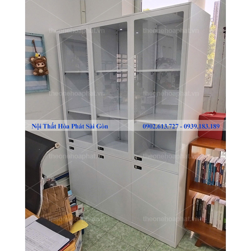 - Thiết kế hiện đại: Gồm 6 khoang lưu trữ rộng rãi: Bên trên có 3 khoang trang bị cửa kính giúp dễ tìm tài liệu, mỗi khoang có 2 đợt di động. Bên dưới có 3 khoang cánh mở, bên trong có 1 đợt di động.
