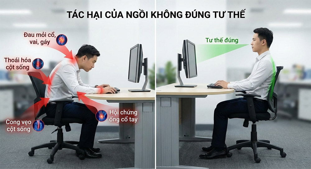 Tư thế ngồi máy tính đúng chuẩn đóng vai trò quan trọng trong việc bảo vệ cột sống và hạn chế đau mỏi khi làm việc lâu dài. Nếu bạn thường xuyên bị đau thắt lưng hay mỏi vai gáy sau mỗi ngày ngồi làm việc, nguyên nhân rất có thể đến từ chiếc ghế và tư thế ngồi chưa đúng. Ngồi sai trong thời gian dài không chỉ gây mệt mỏi mà còn làm tăng nguy cơ gù lưng và thoái hóa cột sống, vì vậy việc điều chỉnh lại tư thế và không gian làm việc theo khuyến nghị y khoa là điều cần thiết.