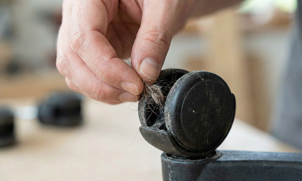 - Dùng nhíp hoặc que nhỏ gắp hết tóc, rác quấn trong trục bánh xe.